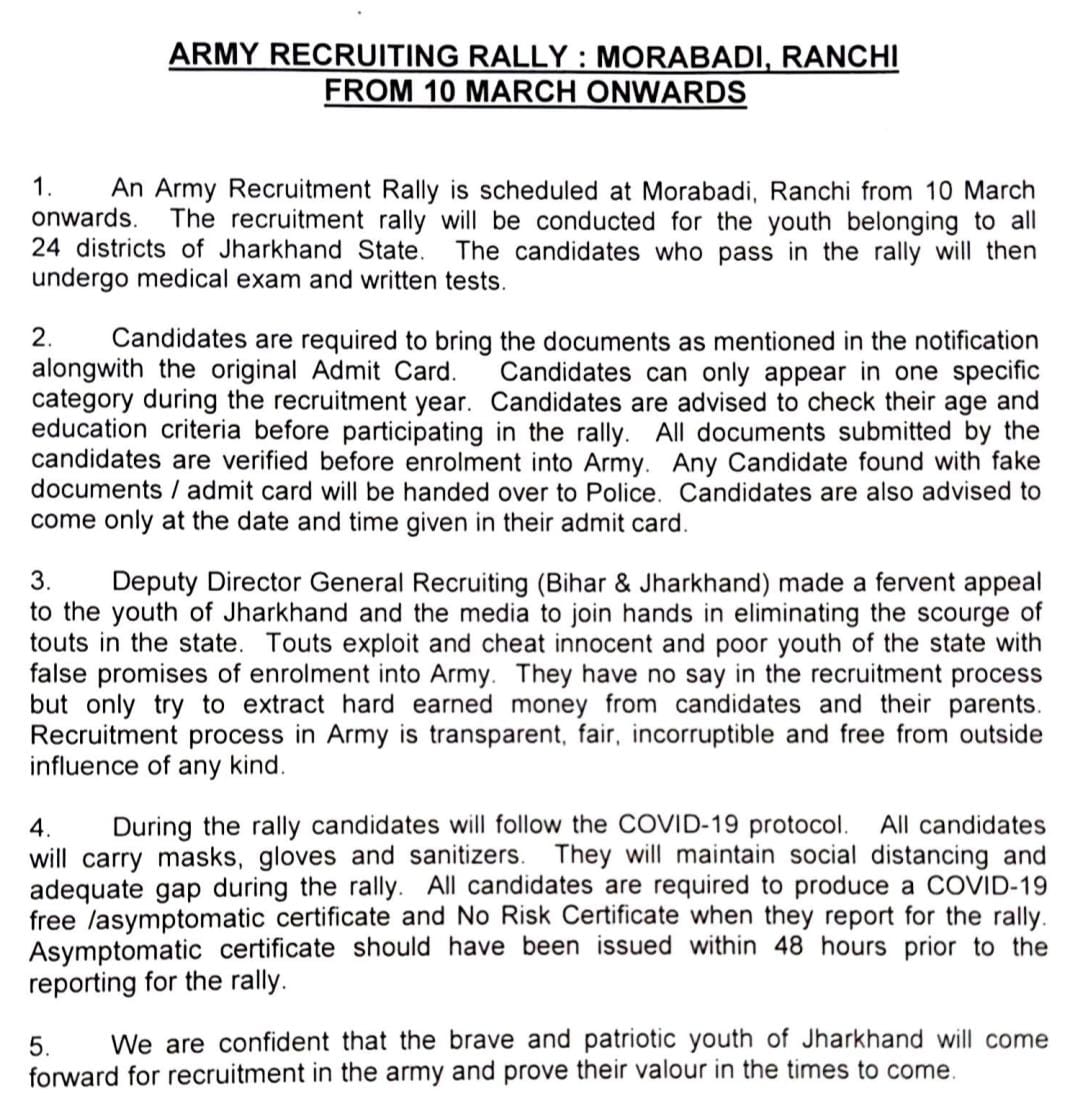 रांची में आज से सेना बहाली शुरू