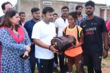 फुटबॉल खिलाड़ी अनिता कुमारी व नीतू लिंडा को फुटबॉल किट देकर सम्मानित किया गया